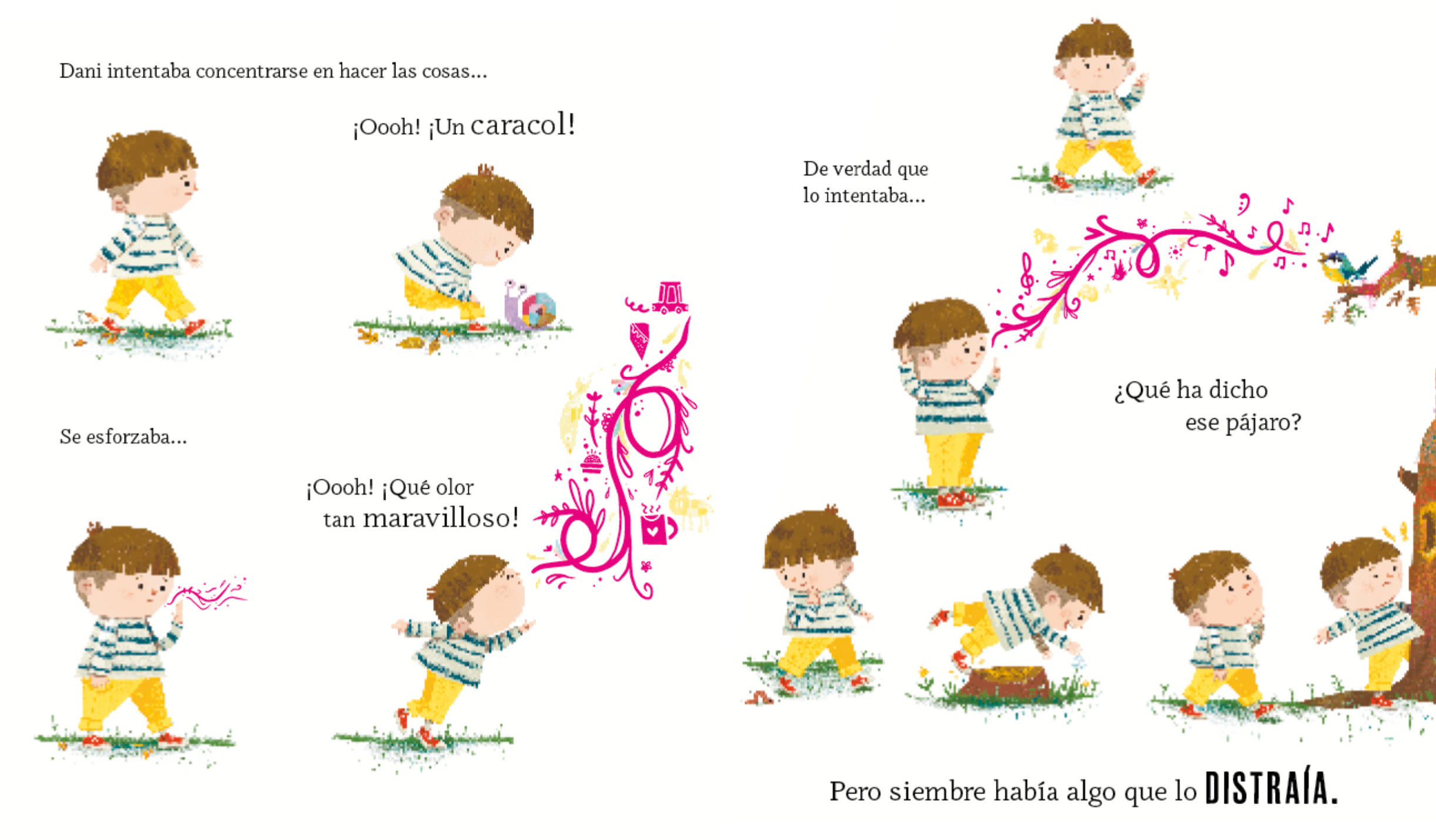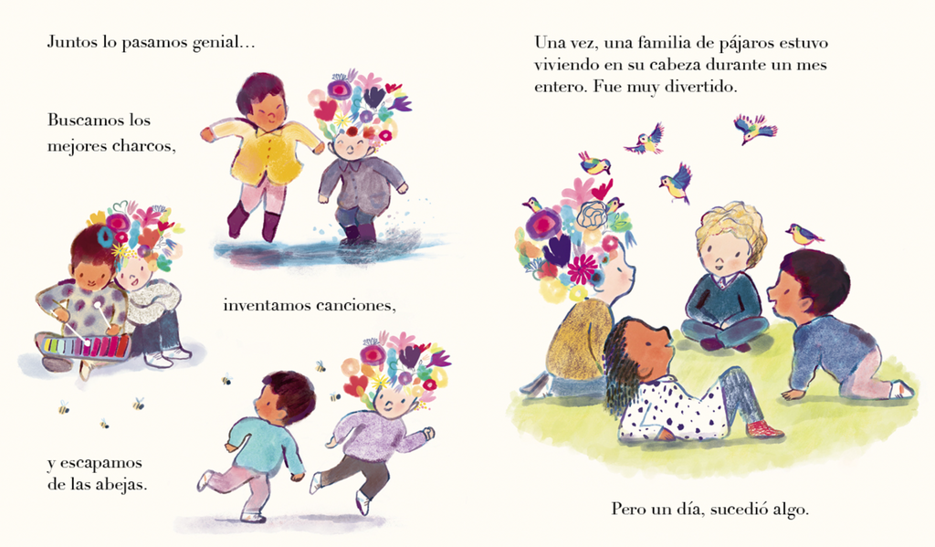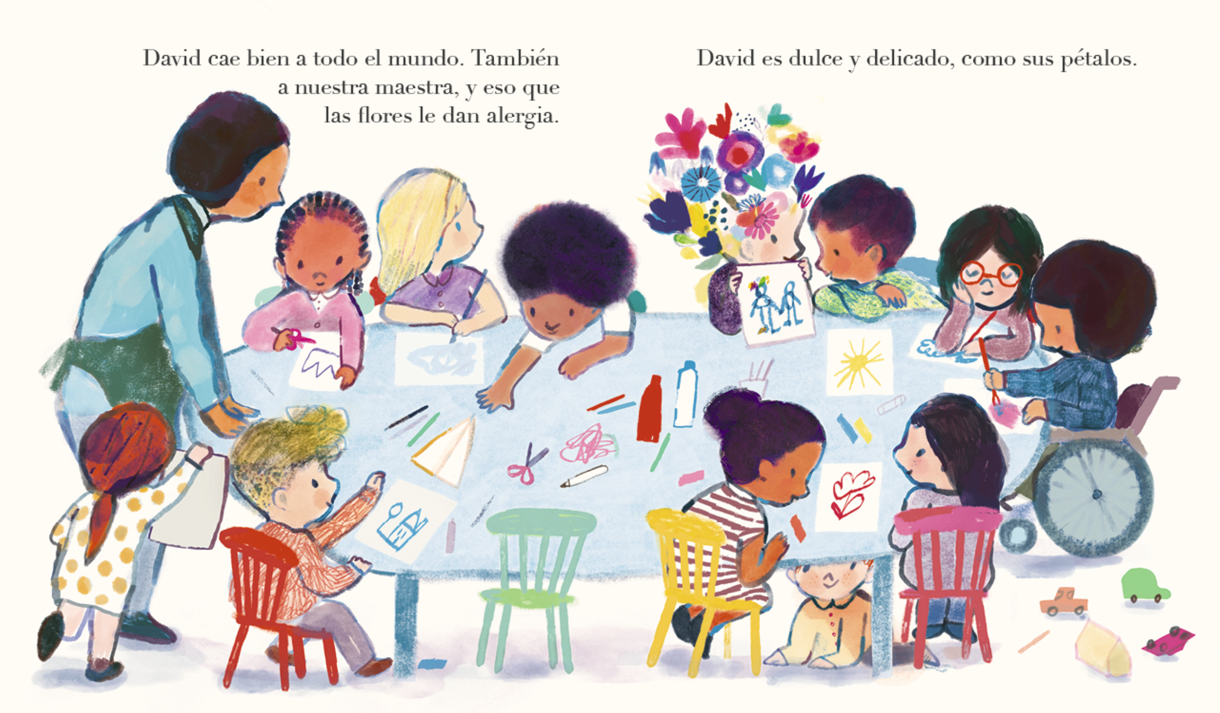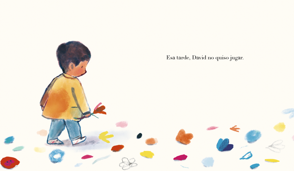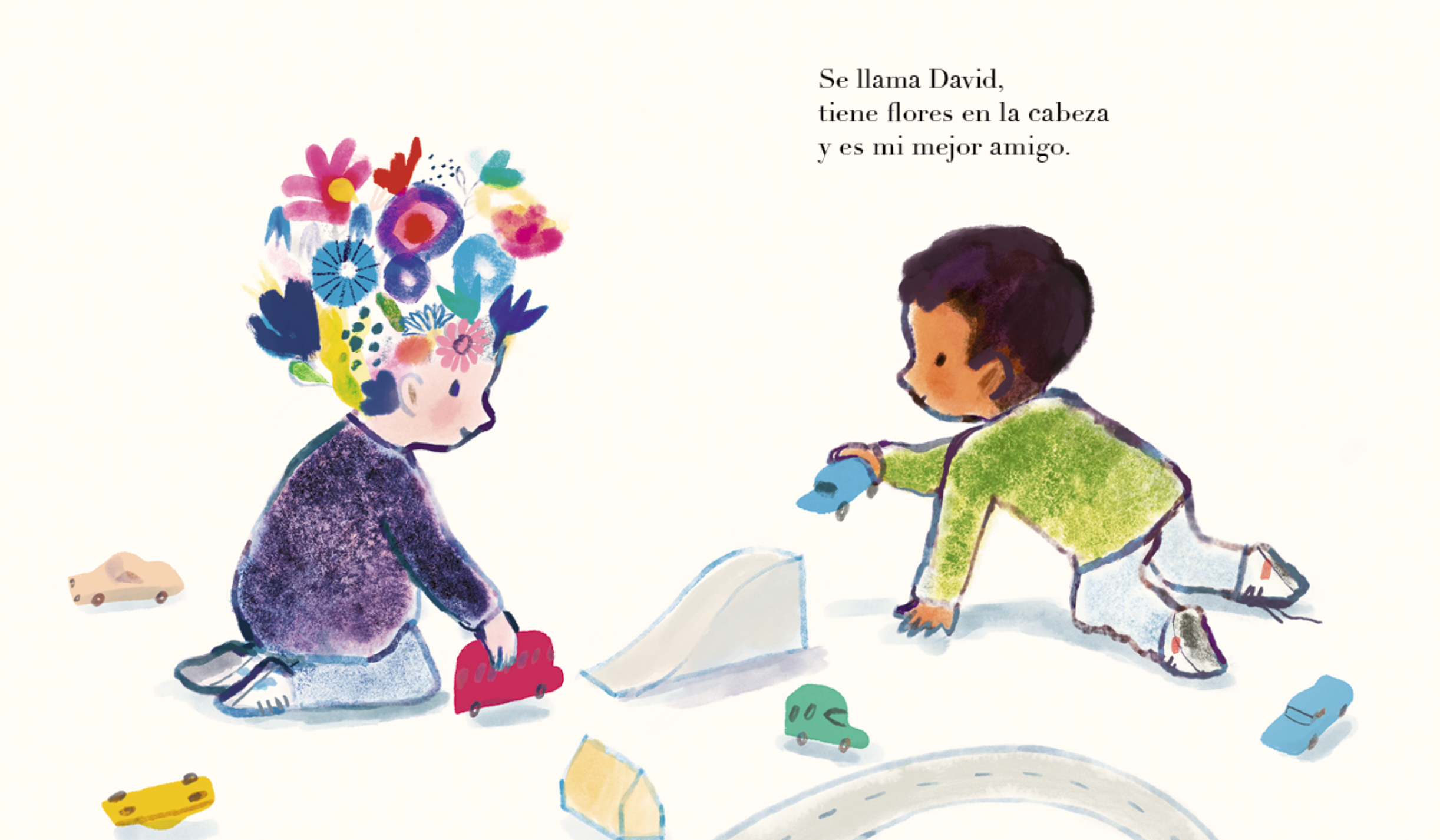 David es muy especial, tiene la cabeza llena de flores. A veces le rodean abejas e incluso pájaros, es muy divertido. Todo el mundo lo quiere. Pero un día comienzan a caérsele los pétalos y su cabeza se queda llena de ramitas que pinchan. David se pone triste y se queda muy callado. Su mejor amigo no puede permitirlo y pone en marcha un plan para devolverle los colores que ha perdido.