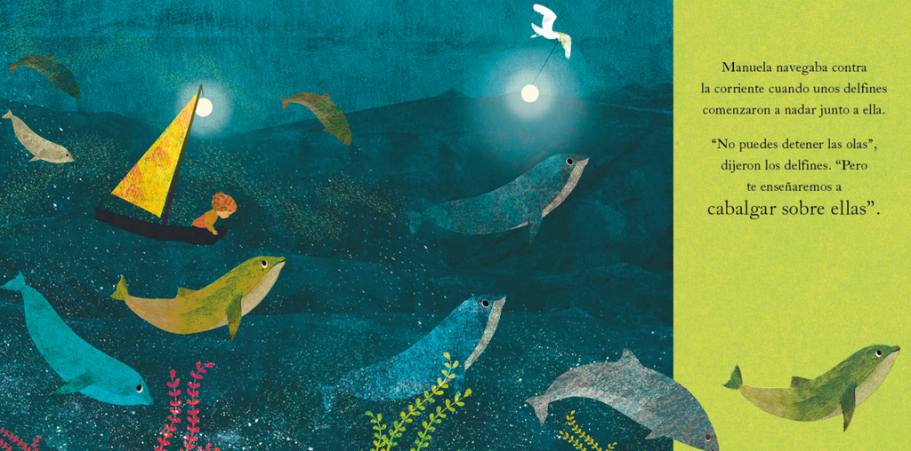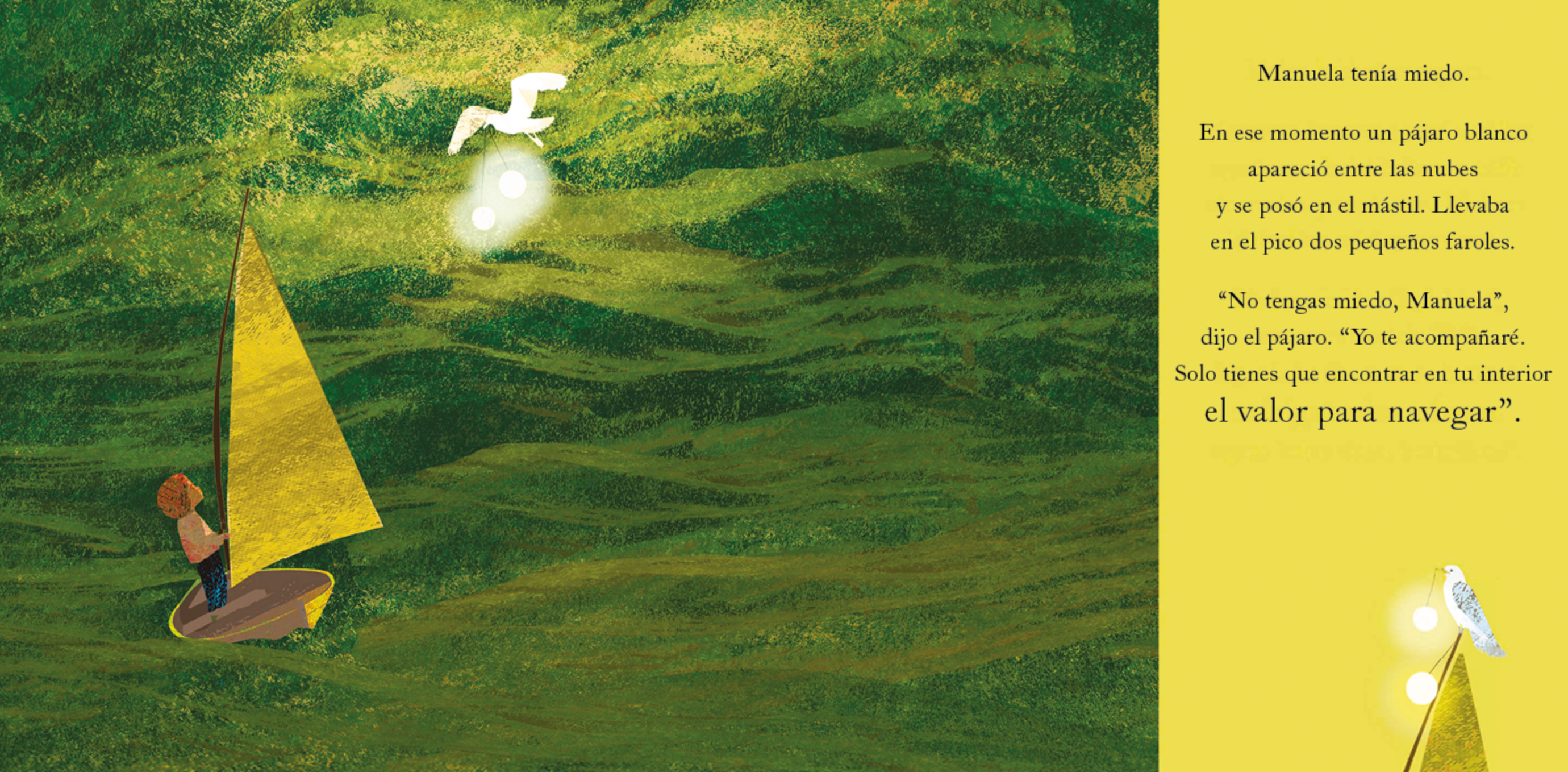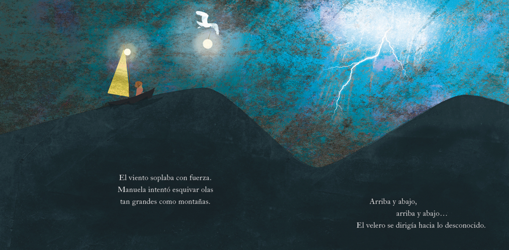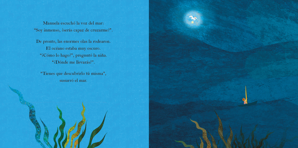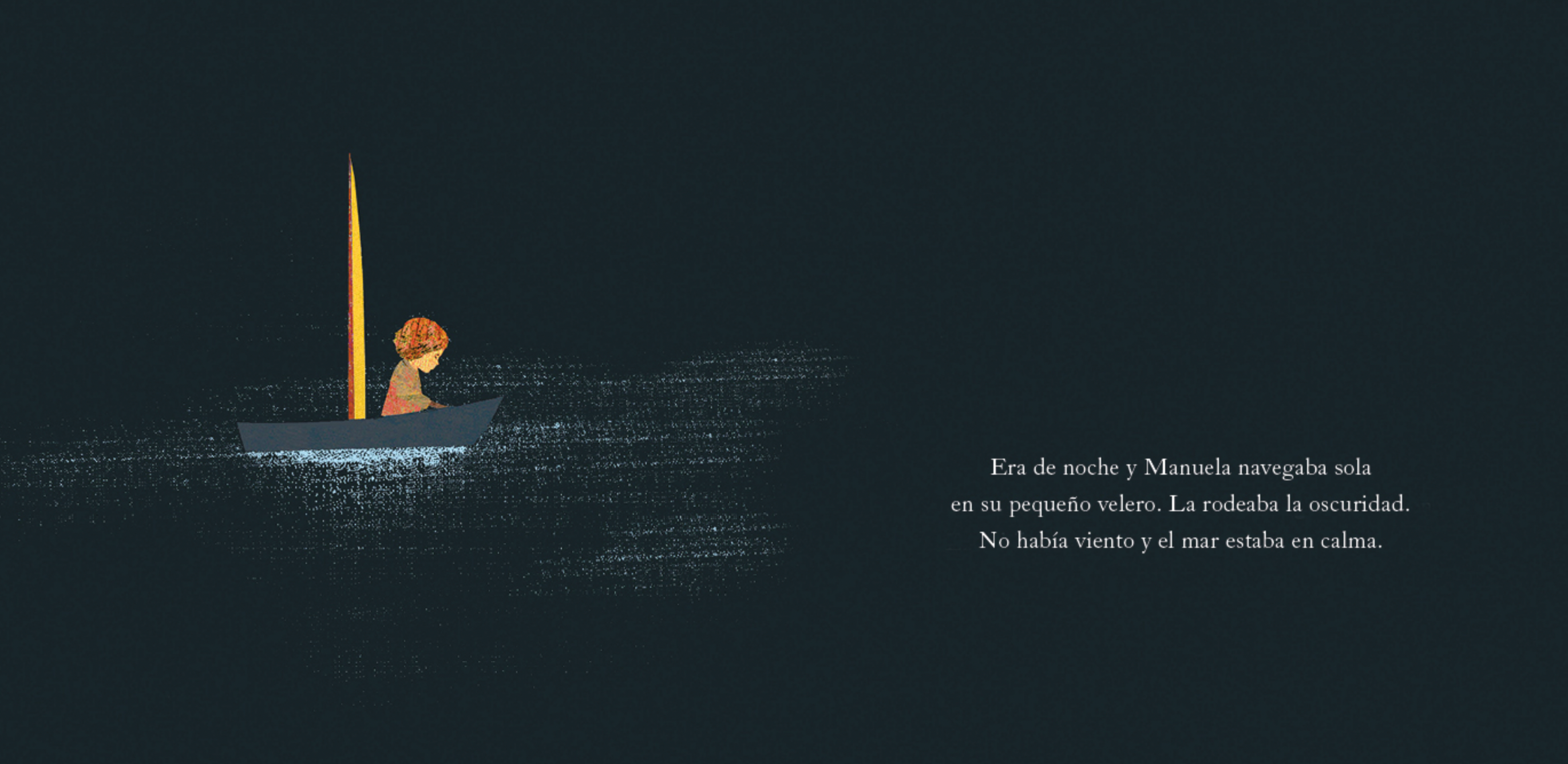 Manuela navega sola en su pequeña barca, pero el mar es oscuro y profundo, y le da miedo. A lo largo de su viaje la acompañan cientos de medusas, delfines, una ballena y una paloma… Todos ellos la ayudarán a atravesar el mar.